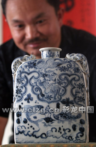一騎戰(zhàn)馬馳騁在廣闊的草原上,一個大漢瀟灑地從馬背上的皮囊中拿出一個扁壺,豪邁暢飲……24日看到這個式樣獨特的元青花“四系扁壺”時,一段珍藏的歷史就這樣自然地呈現(xiàn)出來。“四系扁壺”是云南省首件通過科學(xué)鑒定確認(rèn)的元青花,它是古人放在馬背上裝水、裝酒的特殊器物,而這個扁壺背后還背負(fù)著收藏界一個爭論不休的謎題。