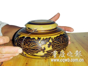 50多歲的永川農(nóng)民劉遠書偶然撿到寶貝:花幾十元錢買來的鄰家喂雞破罐,經(jīng)專家鑒定竟是距今約千年的稀世古瓷——“紫定黃地醬彩剔花蓋罐”。昨日,劉遠書在親戚陪同下赴京尋買主。