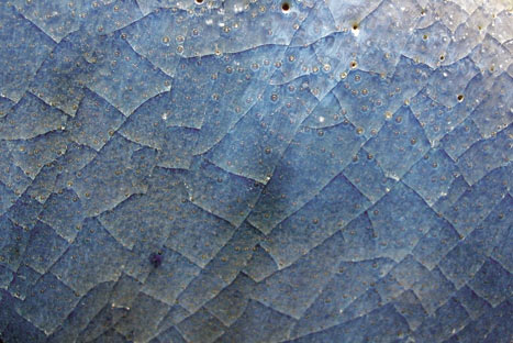 鈞窯瓷器的釉中一般都有大小如針孔的稀疏大氣泡,以及由中小氣泡組成的氣泡群,各氣泡雖然大小不一,比較稀疏,但各氣泡間的距離大體均勻。鈞窯瓷器的氣泡,在器物全身的分布并不完全一致,而是有的部位較明顯,有的部位卻不明顯,也有的鈞窯器物通體都無明顯的氣泡(圖2、金代鈞窯標(biāo)本釉面氣泡;圖3、北宋鈞窯月白釉紫斑碗)。