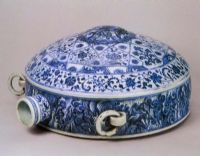 壺直口,細頸,一面扁平,砂底無釉,中心凹入一圈,一面隆起,中心拱出,肩上有雙活環(huán),頸部飾凸弦紋。通體青花紋飾,中心飾水波紋,其外圍及器壁飾纏枝花卉紋,頸飾朵花及纏枝花卉紋。此器造型源自阿拉伯銅器。