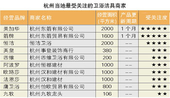 杭州經(jīng)營衛(wèi)浴的商家有350多家,主要品牌有恒潔、箭牌、鷹衛(wèi)浴、東鵬、美加華、九牧、益高、法恩莎、英皇、維可陶、浪鯨、阿波羅等。主要集中在杭州陶瓷品市場、佳好佳國際衛(wèi)陶廣場、華東陶瓷建材市場等市場。這幾個市場的衛(wèi)浴產(chǎn)品幾乎占到整個杭州陶瓷市場的1/3。據(jù)市場調(diào)查分析,雖然杭州消費水平相對較高,但絕大部分衛(wèi)浴產(chǎn)品仍屬于中低檔,物美價廉的產(chǎn)品更受歡迎,所以中低檔產(chǎn)品在杭州市場有很大空間。