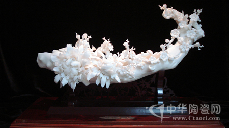 《梅竹爭艷》是周秀燕的嘔心瀝血之作,長33cm,寬21cm,高37cm,經(jīng)過1300多度燒制而成。周秀燕主要采用了梅、竹這兩個題材,通過德化特有的“白如雪、潤如玉、透如絹”的優(yōu)質(zhì)瓷泥,塑造出了栩栩如生、人見人愛的瓷花。