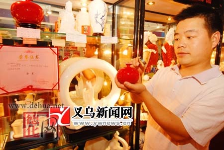 在2009中國(guó)義烏文化產(chǎn)品交易博覽會(huì)工藝美術(shù)作品評(píng)選中,德化陶瓷選送的《和諧》、《春風(fēng)得意馬蹄疾》、《雞毛換糖》、《貴妃醉酒》等4件白瓷工藝美術(shù)作品,分別獲得金獎(jiǎng)、銀獎(jiǎng)和銅獎(jiǎng)。德化陶瓷精品館總經(jīng)理陳濟(jì)金說(shuō),我們以此次獲獎(jiǎng)為動(dòng)力,努力開發(fā)陶瓷工藝新產(chǎn)品,為義烏市場(chǎng)繁榮多作貢獻(xiàn)。圖為陳濟(jì)金在逐件檢查上柜精品陶瓷。