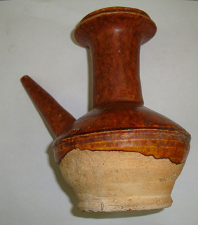 記者看到,捐贈(zèng)的外銷瓷器有軍持、小口瓶、粉盒、碗等。釉色有青釉、青白釉、白釉、醬釉等。器物造型小巧,制作精致。其中宋磁灶窯醬黃釉軍持非常吸引眼球。它的口徑6厘米、底徑6.8厘米、高14.5厘米,盤口長(zhǎng)頸扁圓腹平底,腹部一邊附一長(zhǎng)流,造型高大雄渾,端莊穩(wěn)重,器物周身施醬黃釉,腹底及圈足無(wú)釉。器表為素面無(wú)任何裝飾,磚紅色胎,開(kāi)片不明顯。