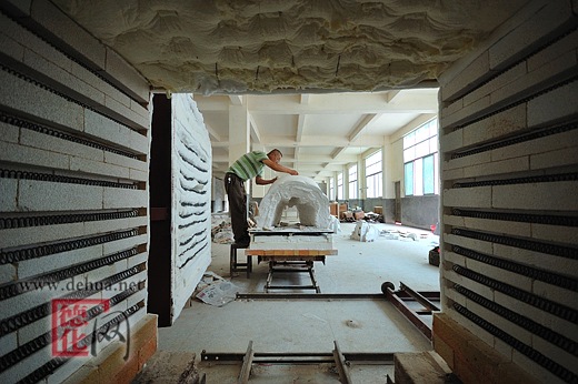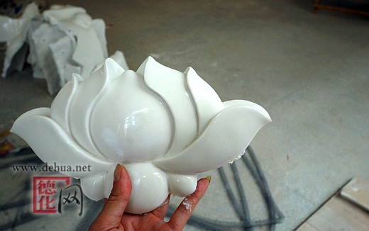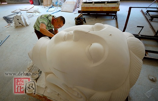 據(jù)了解,“渡海觀音”燒成后高達(dá)6.4米,由國(guó)家級(jí)工藝美術(shù)大師蘇清河領(lǐng)銜打造。2008年10月,在采訪這位瓷雕大師時(shí),筆者在鵬祥工業(yè)區(qū)大型瓷雕“渡海觀音”的燒成車(chē)間里看到,地板上擺放著無(wú)數(shù)塊狀的坯體,兩座電腦自動(dòng)控溫的電窯正進(jìn)行坯體燒制。