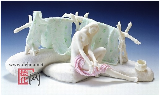 德化瓷素以“白如雪、明如鏡、薄如紙、聲如磬”的特色著稱(chēng)于世,經(jīng)過(guò)創(chuàng)新發(fā)展,更以“溫潤(rùn)、潔凈、雅致、精巧”受到青睞,建白瓷、高白瓷、瓷雕被譽(yù)為現(xiàn)代中國(guó)瓷壇的“三朵金花”。陶瓷深深滲入每一個(gè)德化人的血液,成為他們生命中不可或缺的部分。陳桂玉更是如此。日日夜夜,她心里眼里都是瓷:瓷的晶瑩潔潤(rùn),瓷的芬芳精美,瓷的擲地有聲,瓷的浴火而飛。就在這段時(shí)期,她墜入愛(ài)河。她和柯宏榮,一個(gè)沉默、穩(wěn)重卻又才華橫溢的男孩,在泥與火的藝術(shù)中相知、相戀最終結(jié)成了夫妻,并共同設(shè)計(jì)、創(chuàng)作出了一批瓷雕佳作。
