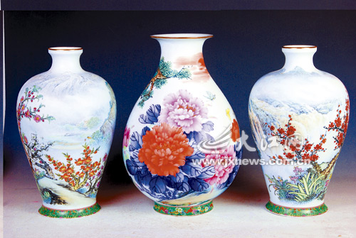 《錦繡中華》特制珍藏瓷以新中國成立60年來,在政治、經(jīng)濟、文化等領(lǐng)域所取得的輝煌成就為主題,以花卉山水為載體,運用工筆與寫意兼容的藝術(shù)手法進行創(chuàng)作。該套瓷由主瓶和一對輔瓶組成。其中,主瓶《祖國花正紅》,以松柏樹和牡丹花、五星花、紫荊花、蓮花合并構(gòu)圖,象征新中國成立60年來在政治上取得的突出地位和繁榮面貌;左輔瓶《華夏千秋富》以杜鵑、臘梅、雪域、天路為主飾,象征新中國成立60年來,經(jīng)濟建設(shè)迅猛騰飛;右輔瓶《神州萬年春》,以桂樹、春蘭、夏荷、秋菊、冬梅等為主飾,配以詩詞歌賦、書法、中國印,寓意新中國成立60年間,各項文化事業(yè)快速發(fā)展。