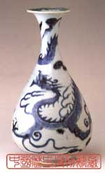 釉下彩技術(shù),是在器物坯材上先用釉料繪出花紋,再上一層無色透明釉,然后高溫?zé)。彩色釉被覆蓋在一層透明釉之下,故稱為釉下彩或釉里彩。若在第一次所施釉中加入鈷(Co)的成分,燒成的瓷器呈藍(lán)青色,稱為青花瓷,這種工藝在唐宋已使用,但不普遍。到了元代,則大量燒制青花瓷器,因釉料中含鈷量的多少不等,加之火候亦有差異,故燒成品的顏色有深有淺。玉壺春瓶的器形前代就有,元代繼續(xù)流行,但頸部縮短,腹部突出,圈足變矮以致近似于平底,增加了穩(wěn)重感。