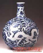此瓶是由景德鎮(zhèn)御窯廠制造的。它圓口、長頸、扁圓腹、平底,腹的兩面飾滿青花海水,各有一條白龍,揚爪騰身,出沒于驚濤駭浪之中,頸部用青花飾以卷草紋、纏枝蓮紋各一道。這是宣德年間(公元l426~l435年)青花瓷器中的典型產(chǎn)品。明永樂、宣德年間是中國青花瓷器生產(chǎn)的成熟階段,其產(chǎn)品以造型清秀典雅,胎體薄,紋飾凝重,青花顏色鮮艷而著稱于世。