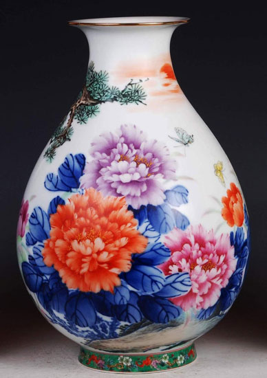 一棵蒼勁的常青松柏,在6朵嬌艷牡丹的襯托下,格外挺拔、偉岸。簇?fù)韲?guó)花牡丹次第開放的是:五星花、紫荊花、蓮花,繁花似錦;一輪冉冉升起的紅日已高過(guò)松柏枝頭,照耀華夏大地,整個(gè)瓶體籠罩在一種金碧輝煌的氛圍之中,體現(xiàn)了新中國(guó)的無(wú)限活力。追逐嬉戲的和平鴿,將福瑞撒滿人間。滿載著悠久文明的東方古國(guó),勇往直前走向輝煌,象征新中國(guó)成立60年來(lái)在政治上取得的突出地位和繁榮面貌!跺\繡中華》主瓶"祖國(guó)花正紅"以明洪武釉里紅纏枝牡丹紋玉壺春瓶為原形。該器形曾經(jīng)在在香港佳士得拍賣,以8323.12萬(wàn)元成交,創(chuàng)造了明代瓷器拍賣的世界記錄。