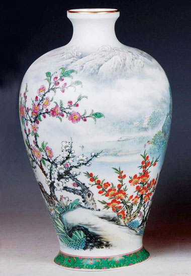 《錦繡中華》兩只輔瓶"華夏千秋富"和"神州萬(wàn)年春"以清乾隆青花穿花龍紋梅瓶為原形。該器形在香港蘇富比曾以1269.475萬(wàn)港幣拍賣價(jià)成交。