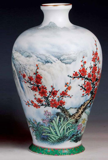 主瓶《祖國(guó)花正紅》玉壺春瓶:細(xì)長(zhǎng)秀美,體現(xiàn)莊重和諧之美