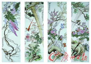 景德鎮(zhèn)粉彩藝術(shù)大師張景壽作品《花鳥(niǎo)四屏》(部分)。