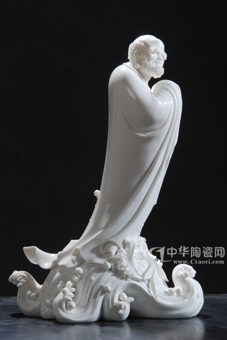 作品瓷質(zhì)堅實厚重,瑩潤潔白,腳踏一葉蘆葦,昂首屹立于浪尖上,給人一種空靈、超脫的心境。兩只突鼓的眼睛炯炯有神,滿臉絡(luò)腮胡子,卷曲盤旋,身材魁梧,形象端莊,儀態(tài)非凡。