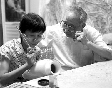珠山八友傳人王錫良大師正在指導(dǎo)曹利英畫瓷