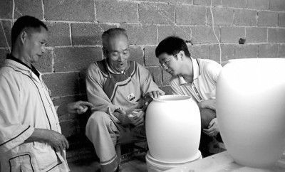 王炎生(左)、陳圣發(fā)(中)正在檢查喜瓷罐