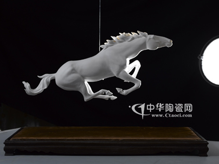 瓷馬也能飛?聽起來就像神話一般,但請您看仔細,展示在您面前的建白瓷塑馬《奔馳》就在空中飛翔,鬃毛迎風舞動,全身肌肉緊繃,具有一躍千里的雄姿。福建省工藝美術大師、高級工藝美術師林建全就捕捉到了駿馬飛躍的那一瞬間。