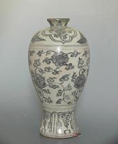 洪武梅瓶的形制在高度上基本承襲元代器皿而來,傳世器皿一般多高達40厘米左右,較元代的大型器略矮,然洪武梅瓶的細部則較元代有了較為明顯的變化。主要表現(xiàn)在二個方面:第一,洪武的梅瓶口多呈微凸的圓唇狀,與元代平沿外折的唇口有別;洪武梅瓶的肩部雖豐,但多作圓弧狀,不如元代的肩部有平坦之感;洪武梅瓶的腹下部內(nèi)收弧度較元代大,因而腹上部顯得較鼓,瓶脛部基本直下,與元代梅瓶脛部微微外撇的風格不同,在總體特征上雖不如元代的穩(wěn)分健,但別有一種秀美的感覺。第二,洪武朝出現(xiàn)了束腰的梅瓶式樣,此種瓶式底下凹頗深,呈圓弧狀,對明代晚期梅瓶的式樣影響頗大。
