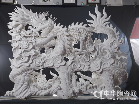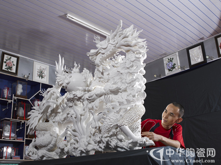 據(jù)兩兄弟介紹,他們?yōu)榱送黄频禄瘹v來的小型瓷雕創(chuàng)作,從2000年開始構(gòu)思,2003年開始燒制大型瓷雕《和諧中國》,每年燒制一尊,都因體積龐大容易變形、斷裂,直至近期才燒制成功。作品《和諧中國》長1.68米,寬1.27米,重約470斤,雙龍戲珠,造型和諧,以龍珠為中心雙龍對稱排列。