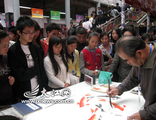 最吸引人的展廳在哪里?根據(jù)記者上午的觀察,是那些提供了現(xiàn)場(chǎng)展示的地方。76歲的繪畫大師揮毫潑墨、年輕漂亮的禮儀表演茶藝、吉州窯展區(qū)的現(xiàn)場(chǎng)制瓷……與以往靜態(tài)展示陶瓷和繪畫作品不同,在今年的瓷博會(huì)上,不少參展商別出心裁地上演“真人秀”,成功吸引參觀者的目光。