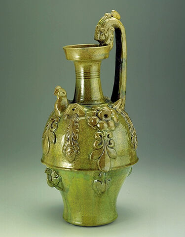 這件出於北 墓中的陶壺不僅罕見(jiàn),而且裝飾精美。它以螭龍為柄,前端塑出雞首,壺上部貼塑對(duì)稱(chēng)的蓮花、忍冬等花葉紋飾,壺下部貼塑四支展翅的鳳鳥(niǎo)。外觀華麗,典雅莊重。新穎的紋飾不僅顯示出當(dāng)時(shí)中國(guó)北方制陶業(yè)的先進(jìn)水平,還反映出中國(guó)與西域各國(guó)文化上的聯(lián)系與交流。