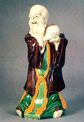 壽星,是民間傳說中主宰人間壽夭之神,即南極老人星。在古代,壽星的地位極為崇高,《尚書》說:“(人有)五福,一曰壽,二曰富,三曰康寧,四曰攸好德,五曰考終命”———五福中“壽”排在首位,可見人類對(duì)長(zhǎng)壽的追求是亙古不變的。自東漢起,祭祀壽星與敬老活動(dòng)結(jié)合在了一起,列入歷朝歷代的祭典,并由帝王親自主持祭祀儀式,直到明代洪武年間才廢除。但此后,民間對(duì)壽星的崇拜卻更為普遍了。 自有壽星崇拜以來,其形象有一個(gè)逐漸演變發(fā)展的過程,到清代已基本定型。河北省博物館藏有一件清康熙年間的素三彩“壽星捧桃瓷像”,就是一位天庭飽滿、鶴發(fā)童顏的古裝老者,手捧鮮桃,含笑而立,那慈祥和藹的面容,令人感覺可親可敬……由此可見,銀發(fā)長(zhǎng)須、頭高額隆、大耳短軀、面目慈祥———凡此種種形象特點(diǎn),于壽星而言是缺一不可的。素三彩,是一種極為珍貴的釉上彩瓷器品種。這種工藝始創(chuàng)于明成化年間,到清康熙時(shí)已日臻成熟。 這個(gè)時(shí)期景德鎮(zhèn)的素三彩瓷器極負(fù)盛名,是素三彩制品最為精致的時(shí)代。素三彩常見的顏色有黃、綠、紫,其制作方法是在高溫?zé)傻乃靥ド嫌貌视蕴钤谝芽虅澓玫募y樣內(nèi),再經(jīng)低溫?zé),因顏色中沒有紅色等鮮艷色彩,顯得素凈、淡雅,故名“素三彩”。當(dāng)然,“三”在文言中有“多”的含義,所以素三彩并不限于黃、綠、紫三種顏色,譬如這件“壽星捧桃瓷像”中,壽星的內(nèi)衣為綠色,飄帶為黃色,外衣和靴子則是施以褐色釉。在此,黃、綠、褐雖皆為素色,但釉色卻很鮮艷,因此并不給人以沉悶濃重之感。