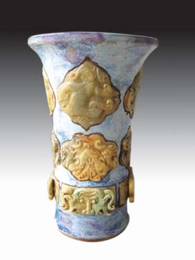 鈞窯是宋五大名窯之一,與汝、官、哥、定諸窯并駕齊驅(qū),此件宋官鈞窯鑲玉大花觚(見圖),體形碩大,造型優(yōu)美,撇口,直腹,圈足。尤其值得關(guān)注的是,在通高38厘米、口徑23.5厘米的觚體四面,鑲嵌著12塊古玉,觚底圈足內(nèi)凹,施醬色護(hù)胎釉,并在底面以金粉刻畫了一只金虁鳳圖案。 觚在中國(guó)古代青銅器時(shí)期即產(chǎn)生,以后逐步沿襲至陶器、瓷器,屬于古代的盛酒器,有圓形、方形,以圓形器為多見。此觚的雍容華貴在于觚上鑲嵌了12枚高浮雕古玉,3枚一組,共四面十二枚,玉件依據(jù)圓形觚的弧度精雕細(xì)作,然后粘貼于觚體上。