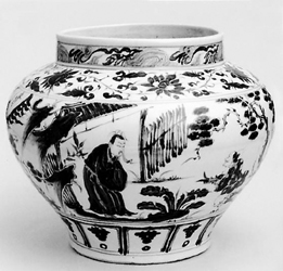 元青花瓷人物題材的作品歷來稀少,據(jù)目前不完全統(tǒng)計(jì),國內(nèi)外僅10余件館藏品,且無一不具有極高的藝術(shù)價(jià)值。人物題材瓷器的出現(xiàn)和元代戲曲小說與版畫的發(fā)達(dá)有著密切的聯(lián)系。當(dāng)時(shí)雜劇、戲劇、歷史故事盛行,景德鎮(zhèn)的工匠將其中有關(guān)情節(jié)繪在瓷器上,頗有意趣,從而顯現(xiàn)了一種新的藝術(shù)境界。罐的器形正適用于描繪敘事性圖案,因此常繪有元曲或通俗故事。這件元青花大罐上所繪的圖案別具一格,值得一書。
