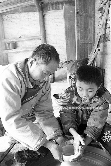 因有一手祖?zhèn)鞯睦鹘^活,一次成型可以拉出多達13節(jié)而且中空的葫蘆,現(xiàn)年76歲的王炎生,于2008年被景德鎮(zhèn)市市政府評定為手工制瓷技藝國家級非物質(zhì)文化遺產(chǎn)的傳承人,每月享受著政府給予的400元津貼。由于5個子女當(dāng)中,沒有一個對陶瓷傳統(tǒng)手工技藝感興趣,日前,擔(dān)心祖?zhèn)鞯睦魇炙嚨阶约哼@一代就失傳的王炎生,在幾經(jīng)思量后,將對陶瓷技藝頗感興趣的外孫梁淵晟正式列為自己的傳承人,希望外孫能將代代相傳下來的拉坯手藝發(fā)揚光大。