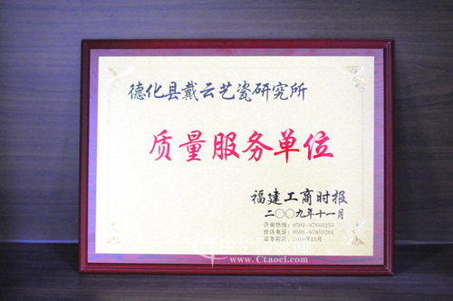 德化縣戴云藝瓷研究所在陳國欽的帶領(lǐng)下,本著“用心溝通、真誠服務(wù)、價格公開、誠信經(jīng)營”的原則,贏得客戶、商家等的贊譽(yù)與信賴。2009年11月,經(jīng)《福建工商時報》的研究決定,同意戴云藝瓷成為福建工商時報質(zhì)量服務(wù)單位。(小俠、小米)