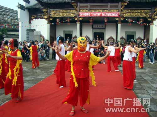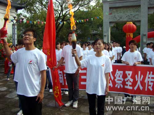 一名老窯工在兩名窯工的陪伴下走進(jìn)佑陶靈祠內(nèi)采集火種,之后將火種交與景德鎮(zhèn)副市長(zhǎng)盧正大點(diǎn)燃了圣火。圣火火炬被再次分成幾把交與圣火隊(duì)開始了從御窯場(chǎng)到中國(guó)瓷園“瓷業(yè)三圣“公祭儀式的接力長(zhǎng)跑。景德鎮(zhèn)沿途圣火接力隊(duì)所經(jīng)之處受到了市民們的熱烈歡迎。