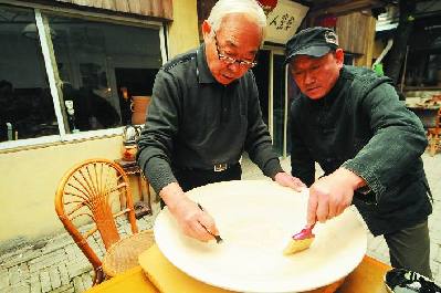 “手要穩(wěn),手腕要有力,刀要傾斜,下刀果斷,刻的線條要清晰、深淺勻稱,一氣呵成。”應(yīng)婺州窯陶瓷研究所所長(zhǎng)、省工藝美術(shù)大師陳新華邀請(qǐng),中國(guó)工藝美術(shù)大師、中國(guó)陶瓷藝術(shù)大師、魯迅美術(shù)學(xué)院陶藝專業(yè)教授關(guān)寶琮近日專程來(lái)到金華,向陳新華傳授半刀泥刻花工藝(如圖,左為關(guān)寶琮)。隨著關(guān)寶琮的講解和手中刻刀在婺州窯大盤素坯上的游走,一幅刀法犀利、灑脫自然、立體感十足的奔馬圖就展現(xiàn)在面前。