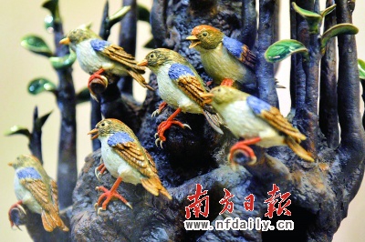 在當天舉行的羅傳作品研討中,中國工藝美術(shù)大師梅文鼎分析了花鳥題材的歷史淵源:石灣陶藝花鳥的淵源很早,在唐代晚期已經(jīng)有花鳥裝飾的器物出現(xiàn)了?梢哉f,花鳥題材在石灣陶藝歷史上相當源遠流長,獨立的花、鳥作品開始涌現(xiàn)出來,成了獨立的藝術(shù)品。而羅傳的作品是在傳統(tǒng)模式基礎(chǔ)上,以陶土的質(zhì)感襯托出花鳥,主題鮮明很吸引觀眾,“他的作品注重細部,對細節(jié)的刻畫一絲不茍。”