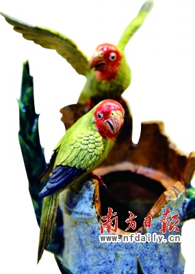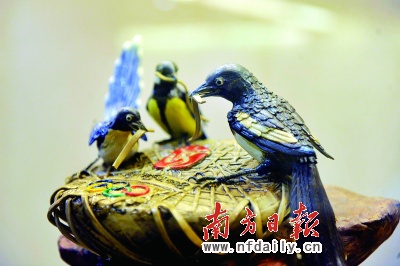 “我把作品的目標消費群體定位在白領(lǐng)以上、具有一定文化水平和鑒賞水平的群體,從實踐中看來,這樣的定位還是不錯的。”體現(xiàn)在作品上,羅傳的作品非常接近自然,現(xiàn)代感十足!赌蛏稀、《同喜》、《喜遷新居》、《蓄勢待發(fā)》等作品,一下子就吸引了年輕游客的注意。