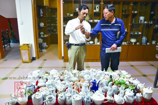 從唐宋元明清,從民國到“文革”,德化收藏家協(xié)會(huì)陳明良會(huì)長就為我們收藏了數(shù)百件各種酒壺(其中有茶壺和水壺)。拋開茶、水壺等器具,我們僅從酒壺說起,因?yàn)樗休d更多的厚重文化。陳明良收藏的酒壺外觀中,有圓的、方的、長的、短的,包括有佛像、宮女等人物造型;還有猴子、鯉魚等動(dòng)物形象;另有果蔬高粱、南瓜等等。