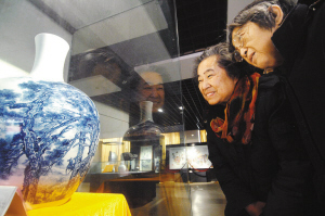 12月13日,兩位北京市民正在中華民族藝術珍品館內(nèi)觀賞由江西景德鎮(zhèn)陶瓷藝術家劉敏創(chuàng)作的入選上海世博會主題館的陶瓷作品。