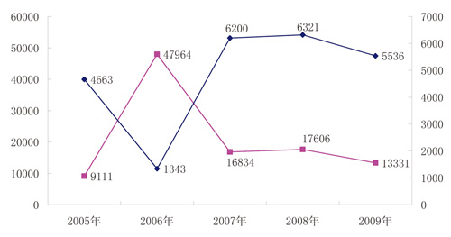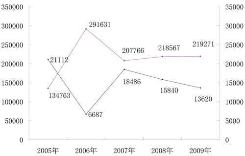2005~2009年中國色釉料進出口量(噸)