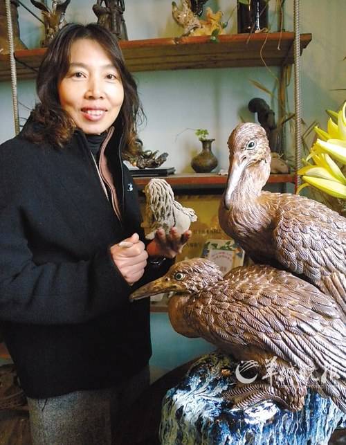 初次見到何惠娟,是在她的“栩之陶藝工作室”中。這位女陶藝家身穿便服,仿佛與擺滿了工作室的作品一樣,親切而溫馨。很難想象眼前這個年輕端莊的女子,自1982年便開始了她的陶藝生涯。師從有“鷹王”之譽的中國工藝美術大師曾良,并于其后的二十多年間,專注于動物陶塑,老鷹、鸕鶿、貓頭鷹、天鵝、喜鵲、雞、鴨、兔子、貓、狗、大象、猴子、牛、豬……在她的手中,被精雕細工的刀法,形和釉的統(tǒng)一,以及點、線、面的相互結合與變化等等技藝,賦予了鮮活的“精神氣”,展翅的雄鷹,護雛的母雞,眺望的兔子皆栩栩如生,甚至臥于桌下仰望的西施狗陶塑,讓記者險些誤以為真。