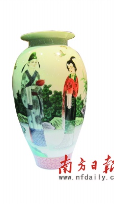工藝美術(shù)大師李文躍為本次展會特地創(chuàng)作了大型粉墨彩瓷板《曲水流觴》,《曲水流觴》取材于王羲之《蘭亭集序》,畫面中一共48個人物,姿態(tài)神情各異,描述了魏晉時期文人雅士隨心所欲、放蕩不羈的名士風范。作品把墨彩技法和粉彩技法巧妙地融合在一起,相映相襯。據(jù)李文躍介紹,粉墨彩結(jié)合是陶瓷藝術(shù)創(chuàng)作上的一個創(chuàng)新,他們從2000年開始,不斷探索實驗,目前已經(jīng)將這種技法運用得相當成熟。和《曲水流觴》一起展出的還有李文躍的高溫窯變粉墨彩作品《春風十里麗人行》。這件作品的背景先用1800℃高溫燒制以后,再進行主題繪制,然后再用780℃高溫燒制。這件作品由于燒制難度較高,李文躍稱之“千窯一寶”。