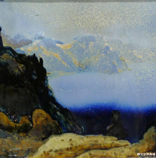 然后,正當(dāng)李家正因?yàn)樯剿盗惺艿綐I(yè)界人士和藏家一致好評(píng)時(shí),他又開(kāi)始思考新的陶瓷藝術(shù)創(chuàng)作;蛘呱畹撵`性賦予它創(chuàng)作的激情,又或許豐富的人生感悟,澄澈的審美思維和濃厚的書(shū)畫(huà)功底,讓他的陶瓷創(chuàng)作之路越走越順。最后,李家正選擇在高溫顏色釉上下功夫,無(wú)數(shù)的失敗沒(méi)讓他選擇放棄。在創(chuàng)作第一幅作品《海濤》時(shí),他無(wú)可厚非的開(kāi)創(chuàng)了純顏色釉來(lái)創(chuàng)作山水畫(huà),并逐步形成了他新的風(fēng)格。他創(chuàng)作的高溫顏色釉山水作品中色彩輝映、氣勢(shì)恢宏,《海濤》就運(yùn)用了細(xì)化光和色的手法表現(xiàn),振幅作品呈現(xiàn)出水波涌動(dòng)的效果,浪花飛濺。另一幅作品《黃河之源》形象表現(xiàn)了壺口瀑布,高原之水,帶有泥沙的咆哮而來(lái),垂直而下,水花成霧,給人洶涌澎湃、氣勢(shì)磅礴之感。
