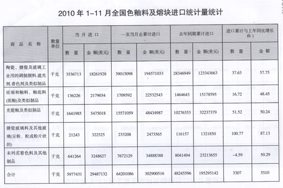 2010年1-11月全國(guó)色釉料及熔塊進(jìn)口統(tǒng)計(jì)量統(tǒng)計(jì)