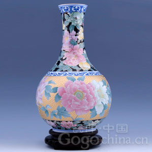 袁述凡大師手繪·釉下五彩富貴東方描金玉壺春瓶
