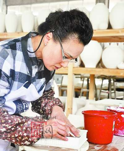 在德化儒苑禮品有限公司生產(chǎn)車間,47歲的技術(shù)工李霞蓮一邊嫻熟地給陶瓷坯體上釉,一邊跟記者聊起來(lái)。
