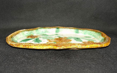 海棠式長盤:遼瓷典型器之一,因全器若海棠花形而得名,盤面較扁長、折沿、淺腹、平底,多以三彩印花裝飾。瓷制品源于木制餐具。這種器物也常見于遼墓壁畫。
