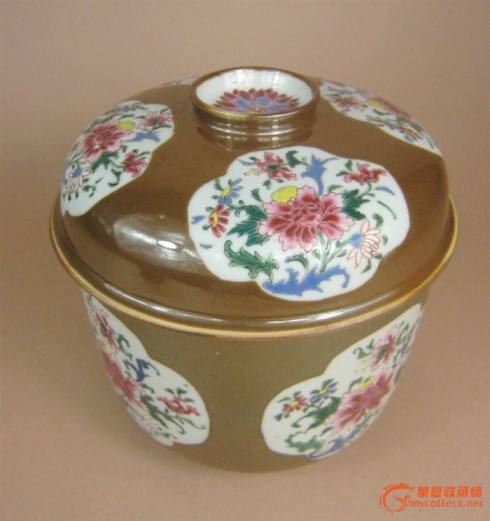 清雍正 超大號醬釉開光粉彩花卉大蓋盆