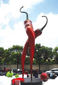 本屆展會(huì)的另一大亮點(diǎn)是由新加坡女藝術(shù)家?guī)飕旣悇?chuàng)作的大型雕塑《幸福探戈》,今年被確定為藝博會(huì)的主題雕塑作品,并被放置在舉辦場(chǎng)館世貿(mào)商城門口最顯著的位置!缎腋L礁辍犯哌_(dá)六米,以兩只體態(tài)修長(zhǎng)的紅辣椒為探戈舞的主角,神態(tài)生動(dòng),舞步狂放,使人的耳畔與雙眸仿佛能夠鮮活地聽(tīng)到并看到節(jié)奏明快、華麗高雅、變化無(wú)窮的探戈在熱烈舞動(dòng)。