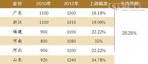 2010、2012我國(guó)衛(wèi)浴主要產(chǎn)區(qū)所在省份最低工資第一檔標(biāo)準(zhǔn)對(duì)比情況一覽表(單位:元)
