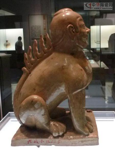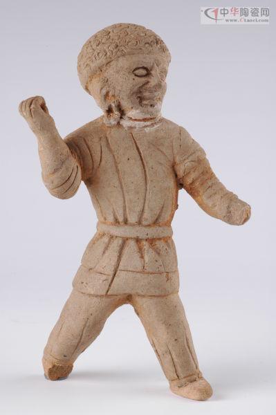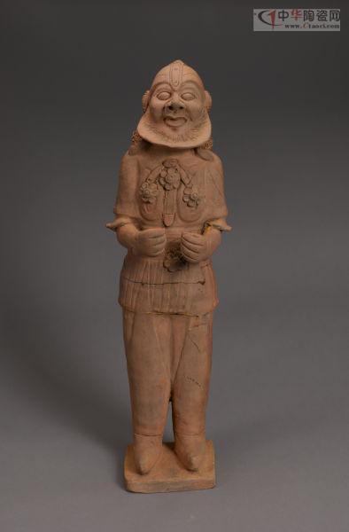 1972年出土于湘陰縣城南公社隋大業(yè)六年墓葬中,是一件不可多得的有準(zhǔn)確紀(jì)年的隋代胡俑。該俑為陶質(zhì),高27厘米,濃眉大眼,高鼻,絡(luò)腮胡須,綰發(fā)小冠,上身著寬袖開襟衣服,胸前系帶,下穿百褶褲,褲筒碩大,系有繩帶,雙手持杖立于身前,腳穿草鞋。