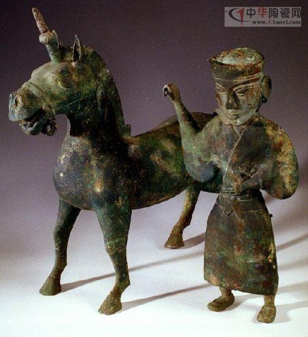 1958年出土于長(zhǎng)沙赤崗沖唐墓。牽馬胡俑,陶質(zhì),高14.9厘米,大眼,高鼻梁,大鼻頭,卷曲的頭發(fā),雙耳戴環(huán),身穿圓領(lǐng)緊身衣,雙袖挽起,腰間系帶,足蹬尖頭靴。該俑右手舉起,作拉繩狀,左手前伸,為牽繩狀。這座唐墓中亦出土了一匹陶馬,故此俑應(yīng)是牽馬胡俑。