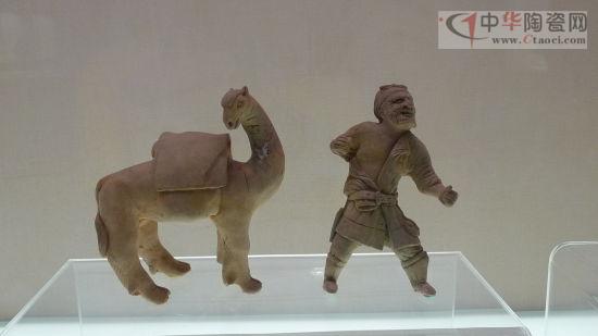 胡人俑,陶質(zhì),高18厘米。深目高鼻,滿臉絡(luò)腮胡須,頭系幞巾,身著緊身翻領(lǐng)窄袖衣,右肩袒露,腰間系革帶,帶上掛腰刀等物什,腳穿長(zhǎng)筒靴。胡人飽受風(fēng)沙,滿臉滄桑,道道皺紋,清晰可見。他右手挽起,身體前傾,似在拽著駱駝前行。而載著貨物的駱駝卻作回首狀,好像在逗樂主人,一副溫順可愛、又調(diào)皮搗蛋的模樣。駱駝俑也為陶質(zhì),高18.5厘米,長(zhǎng)17厘米。駱駝和胡人常常成組出現(xiàn),杜甫《寓目》:“胡兒掣駱駝”,駱駝與胡人的組合反映出我國(guó)與西亞各國(guó)頻繁的貿(mào)易往來和文化交流。